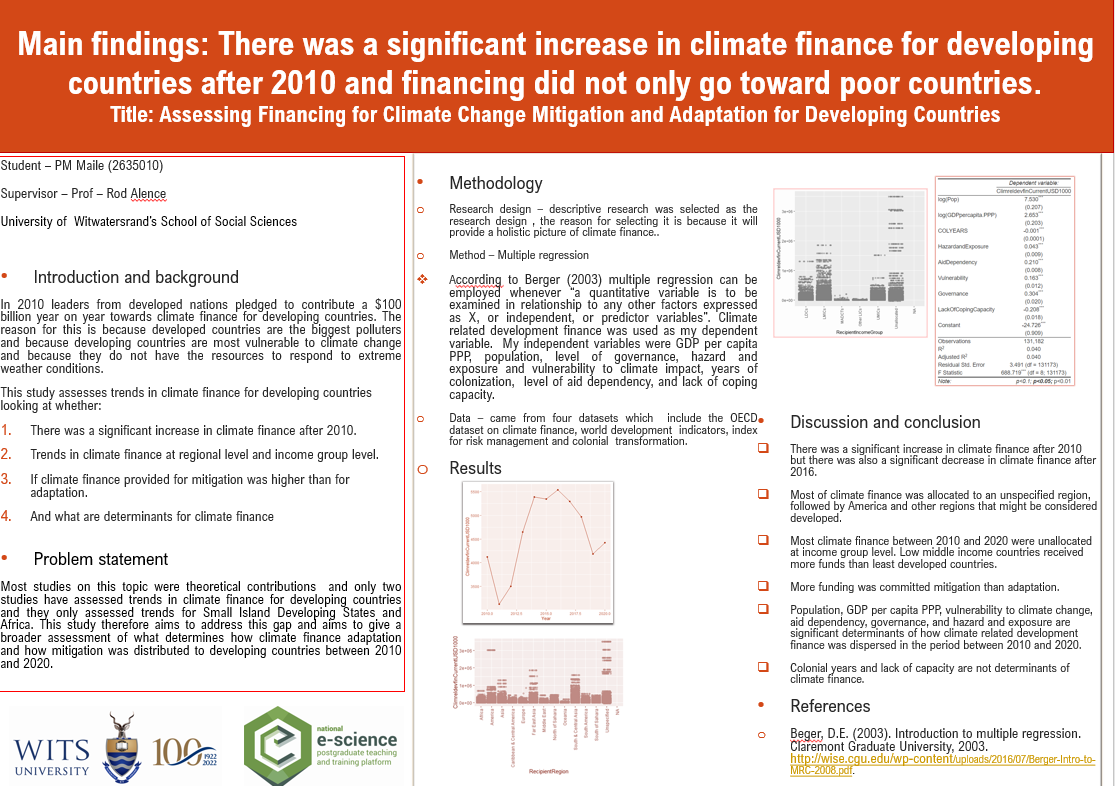 In 2010 leaders from developed nations pledged to contribute a $100 billion year on year towards climate finance for developing countries. The reason for this is because developed countries are the biggest polluters and because developing countries are most vulnerable to climate change and because they do not have the resources to respond to extreme weather conditions. This study assesses trends in climate finance for developing countries looking at whether: There was a significant increase in climate finance after 2010. Trends in climate finance at regional level and income group level. If climate finance provided for mitigation was higher than for adaptation. And what are determinants for climate finance.